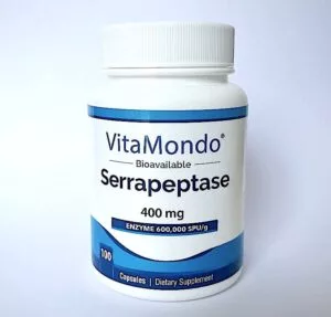 Serrapeptase 600 SPU/mg (400 mg per capsule). Produced via fermentation with non-pathogenic Enterobacteriaceae. Freeze-dried. Acid-resistant, enteric-coated capsules for optimal delivery to the small intestine.