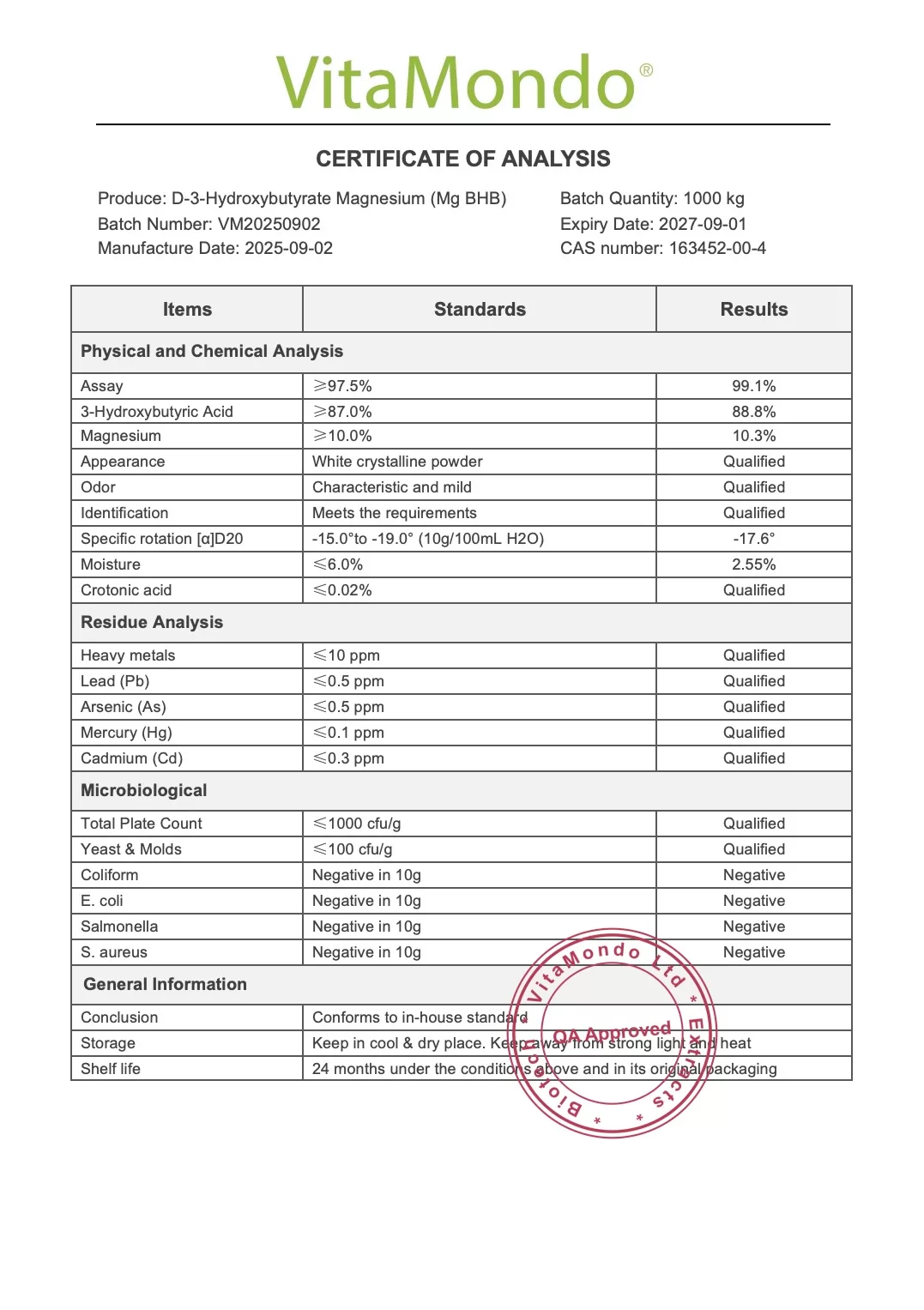 Magnesium BHB (β-Hydroxybutyrate) 99% is a high-purity exogenous ketone powder designed to support cellular energy production, metabolic flexibility, and neuromuscular function. This advanced compound delivers beta-hydroxybutyrate, the body’s preferred ketone, bound to magnesium for enhanced electrolyte and physiological support.