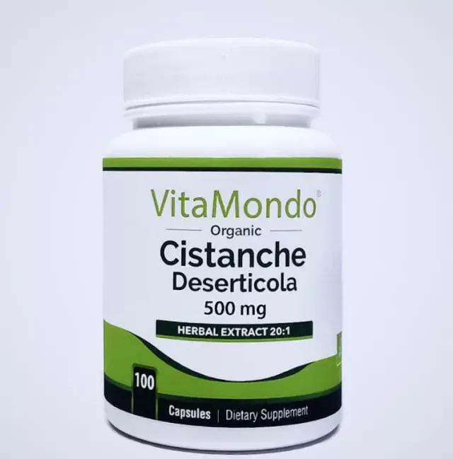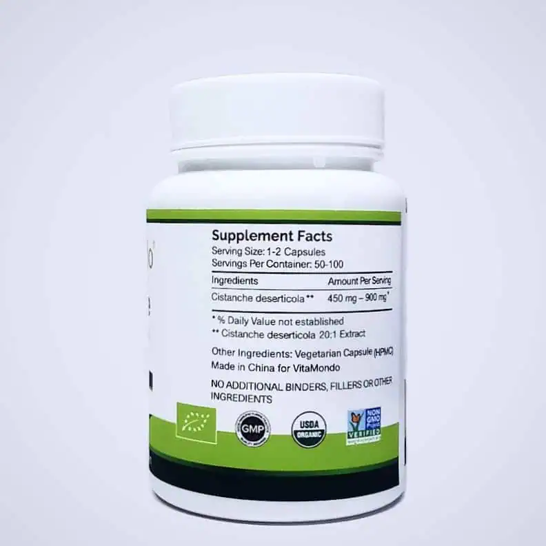 Organic Cistanche Deserticola Supplement. 20:1 pure water extract. Vegetarian cellulose capsules.