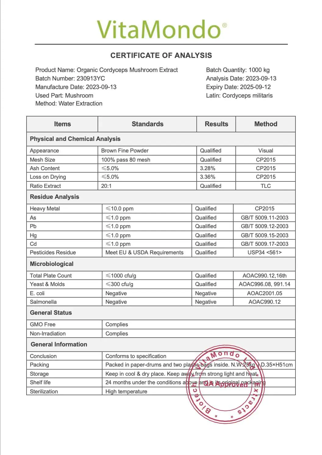 - Antioxidant Protection – Organic cordyceps extract is rich in antioxidants to neutralize free radicals and protect cells from oxidative stress.