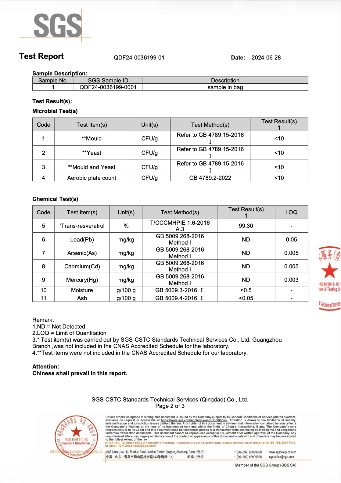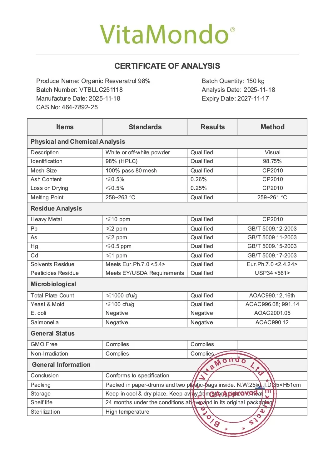 Organic Resveratrol Extract Powder 98% (trans-isomer), sourced from Polygonum cuspidatum. No additives. Tested for purity and free from bacterial and heavy metal contaminants.
