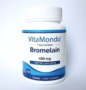Pineapple Bromelain 2400 GDU/g (3600 MCU/g) extracted from Ananas comosus fruit stems. 400 mg enteric-coated capsules, 100 capsules per bottle.