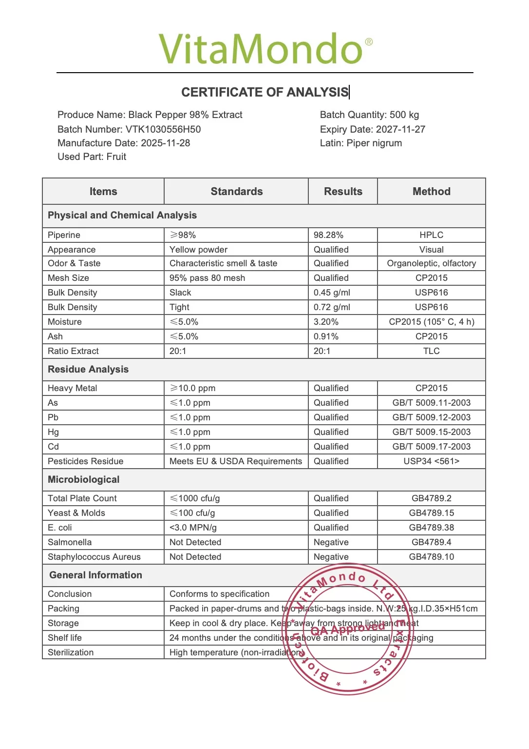 Piperine powder exhibits antioxidant properties, helping to neutralize free radicals and reduce oxidative stress. Oxidative stress is associated with cellular aging and environmental challenges, and compounds that support antioxidant balance contribute to long-term cellular health.