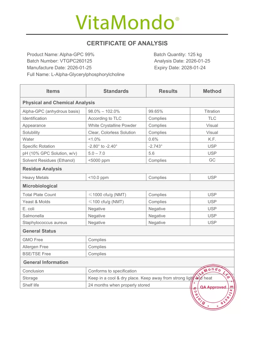 Premium Alpha-GPC 99% (L-Alpha-Glycerylphosphorylcholine). 100% pure, no fillers.