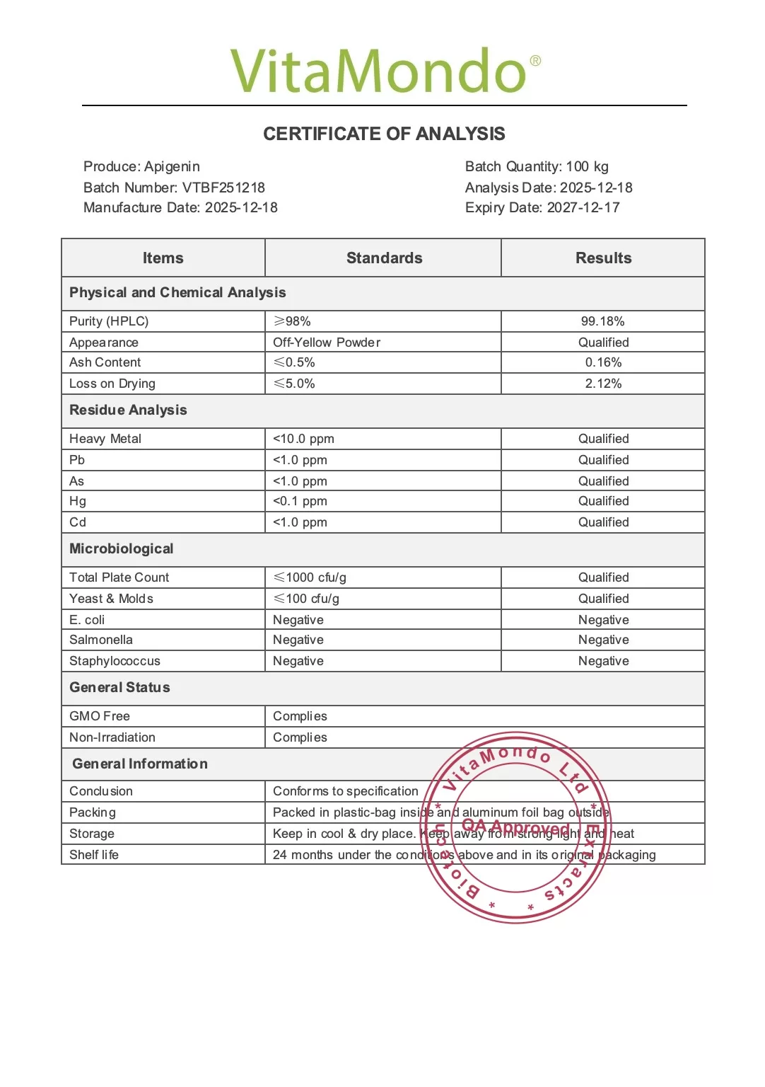 Our Premium Apigenin Supplement is extracted from Matricaria chamomilla (chamomile flower) and standardised to ≥99% purity for consistent quality.