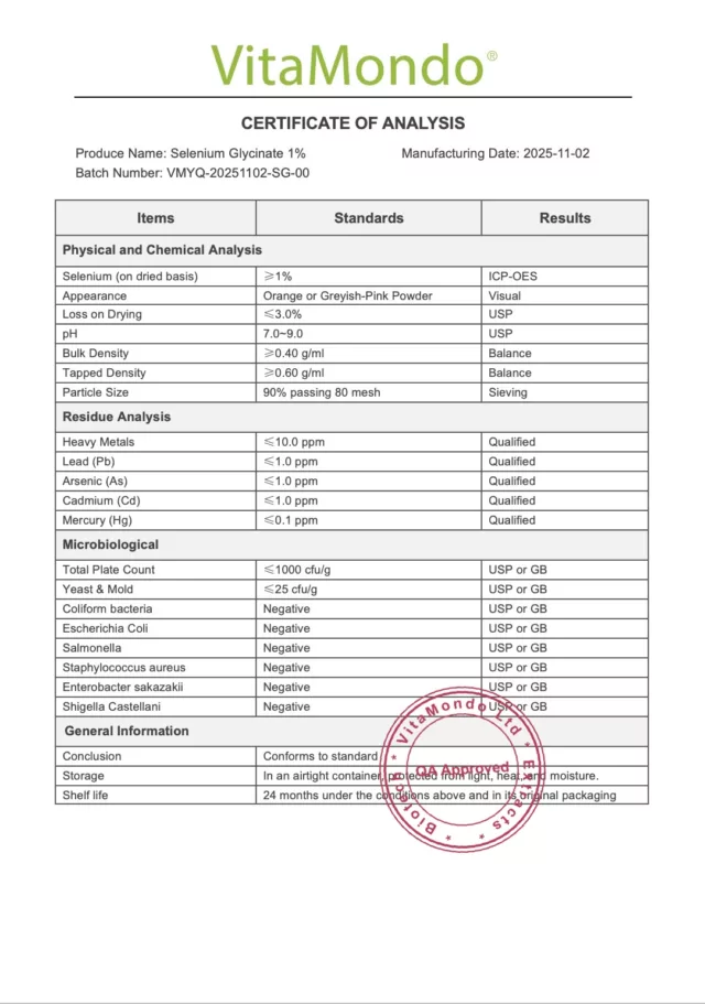 Selenium Glycinate is a chelated form of selenium in which the mineral is bound to the amino acid glycine, resulting in high stability and bioavailability. Selenium is an essential trace element involved in antioxidant defense systems, thyroid hormone metabolism, and normal immune system function.