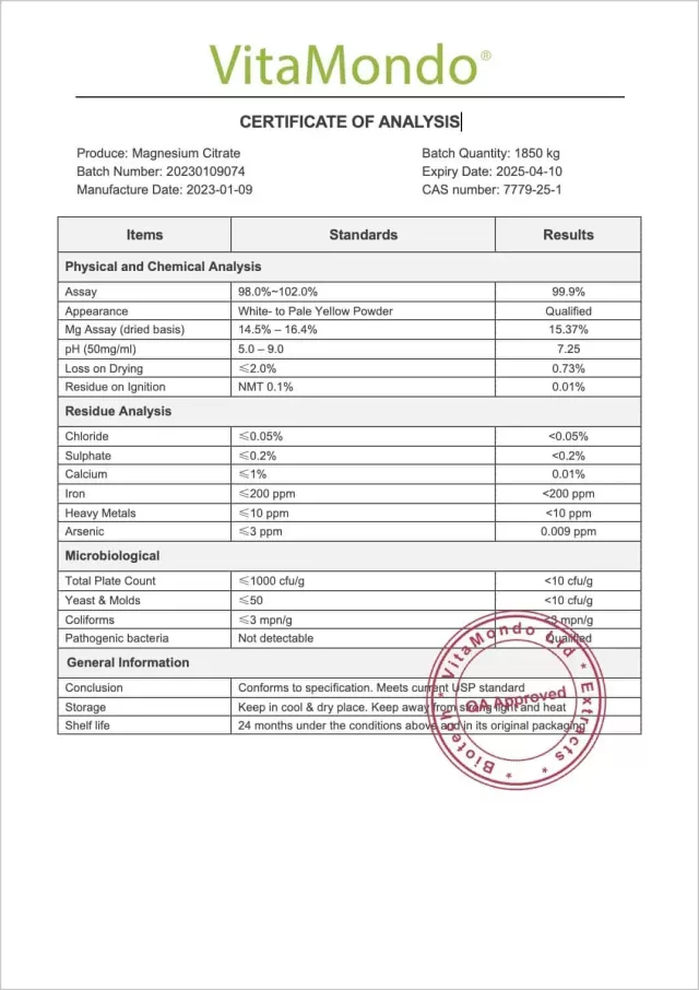 Magnesium citrate is generally well tolerated at recommended amounts. Excessive intake may have a laxative effect. Those with kidney concerns or on certain medications should consult a qualified health professional before use. Store in a cool, dry place.